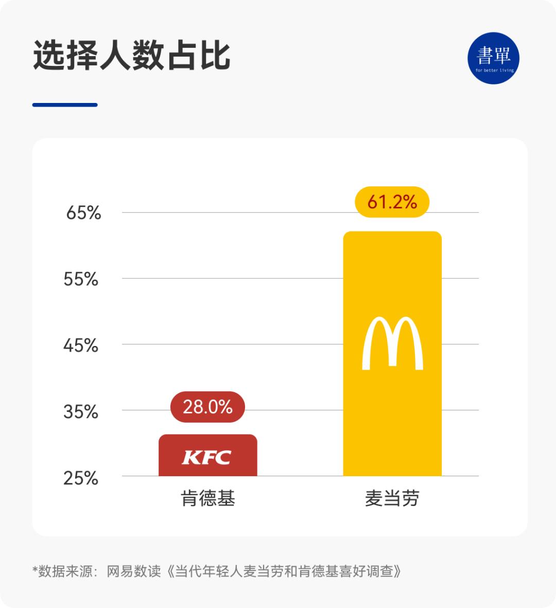 2022年,网易数读发布过一个《当代年轻人麦当劳和肯德基喜好调查》,在最终选择人数占比中,麦当劳以 61.2% 遥遥领先肯德基的 28.8%。