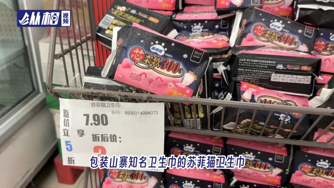 然后,记者在里面走了一圈,还是发现了一些异常。货架上在销售的商品多为不知名的品牌或山寨品牌,而不少食品、调味品还是临期的。在女士皮包区,不少皮包明显是假冒的奢侈品款式;日用品区,还有“苏菲猫”这样品牌名的女性卫生巾。此外,少部分看上去是知名品牌的商品,尽管标价都是打五折,但实际售价很难说得上实惠。