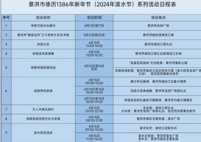 据了解,景洪市傣历1386年新年节(2024年泼水节)系列活动将于4月11日至17日举行,期间有民族民间传统文化大游演、传统龙舟表演赛、万人齐放孔明灯、 泼水狂欢等活动。