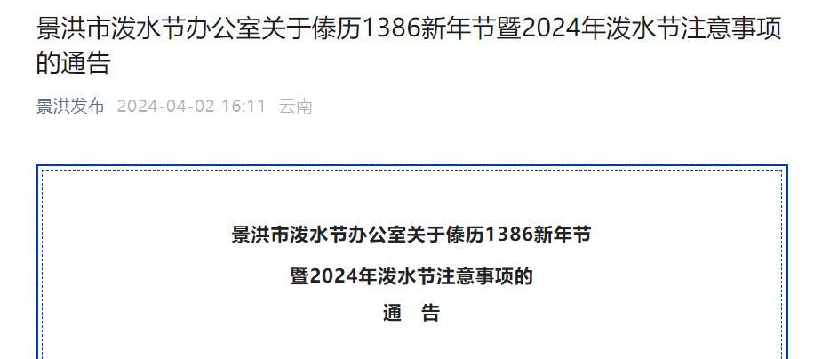 “景洪发布”4月2日发布《景洪市泼水节办公室关于傣历1386新年节,暨2024年泼水节注意事项的通告》。
