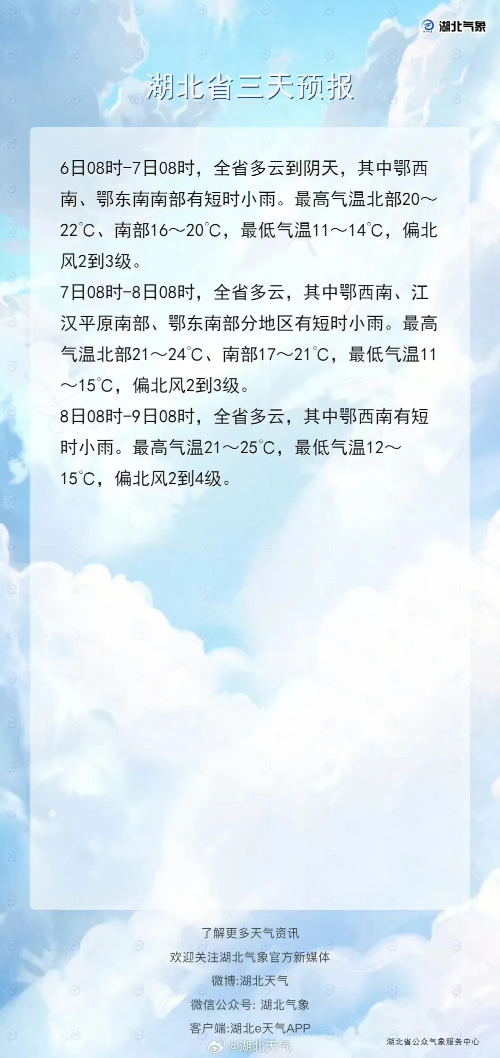 据湖北气象局6日消息,预计未来三天雨水逐渐撤离,全省将以多云天气为主,不过南部仍有短时小雨残留。随着雨水的消退,未来三天气温缓慢升高,后天大部分地区最高气温将达到21~25℃。最新天气预报