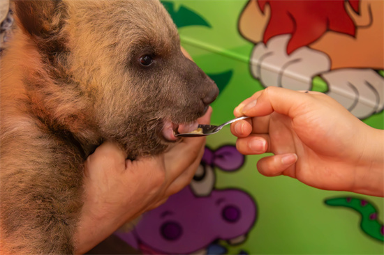 据悉,这只棕熊幼崽是1月31日出生的。由于棕熊妈妈育儿经验不足,尚未满月的小棕熊一度生命垂危,饲养员紧急将它送往动物幼儿园,进行人工救助和喂养。
