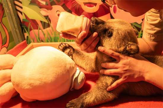 经过一个多月的“休养”,在育幼员和兽医们的保驾护航下,小棕熊现在已经是动物幼儿园这一届食量第一的“小朋友”了。它现在一顿能喝125克奶,育幼员们还会逐步给它增添一些好消化的食物作为辅食,比如新鲜的苹果泥等。