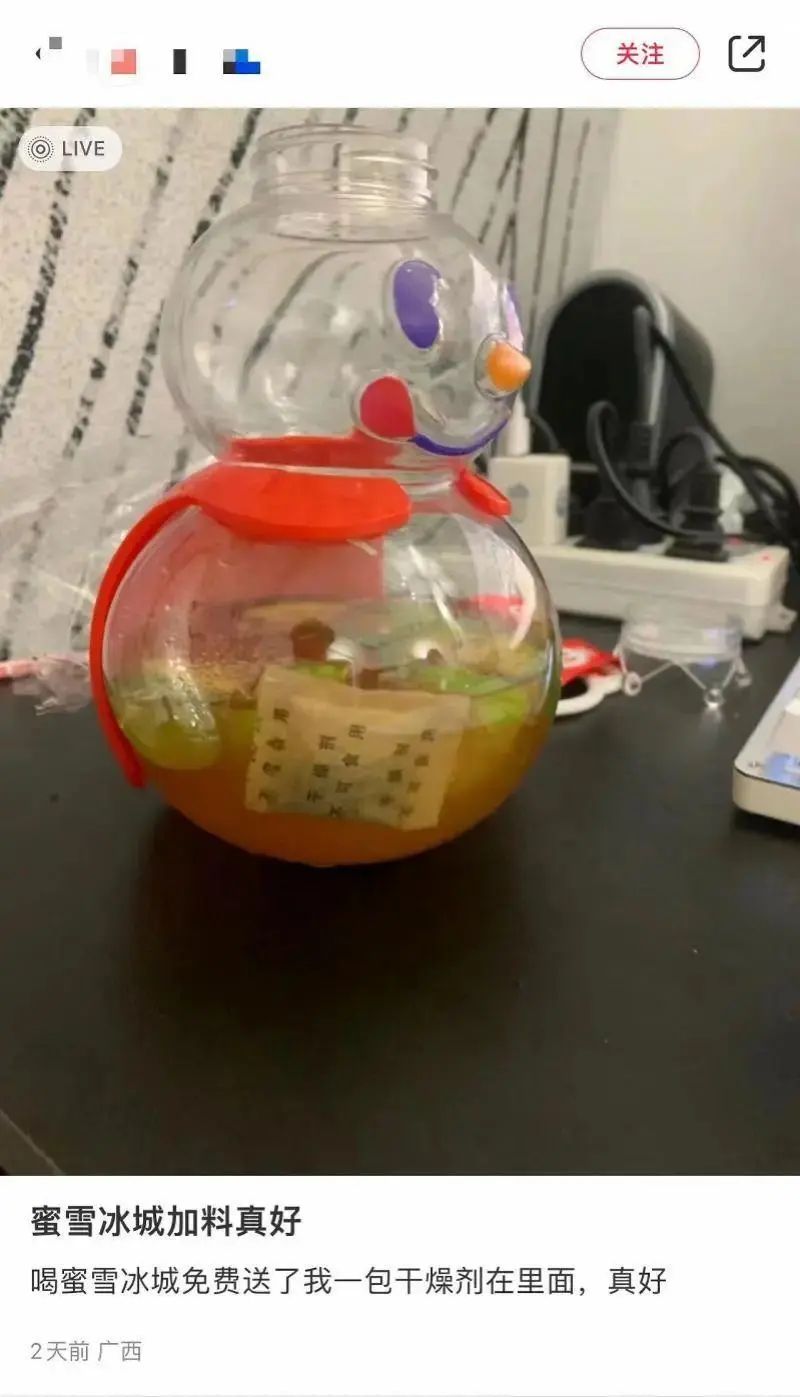 根据媒体报道,蜜雪冰城(广州大塘公交车站店)店员表示,雪王桶在出厂时本来就有干燥剂。南都·湾财社记者注意到,就在3月26日,有来自广西的消费者在社交媒体上发帖称,其在蜜雪冰城用雪王桶装着的饮品中喝出干燥剂。在去年8月,也有消费者发帖称,其在蜜雪冰城用吨吨桶装着的饮品中喝出干燥剂。