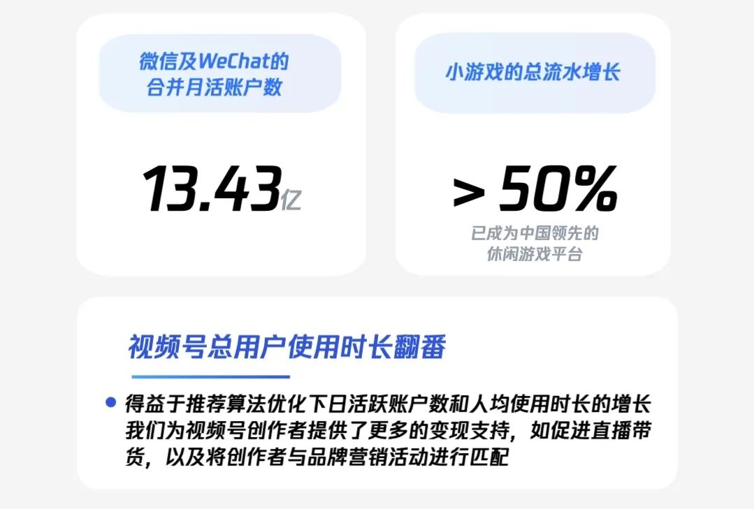 增长的首要动力还是视频号。财报提到2023年视频号用户使用时长增长翻倍,四季度产生收入的创作者数量同比增长两倍多。腾讯还为视频号创作者提供了更多的变现支持,如促进直播带货,以及撮合创作者与品牌进行营销活动合作。