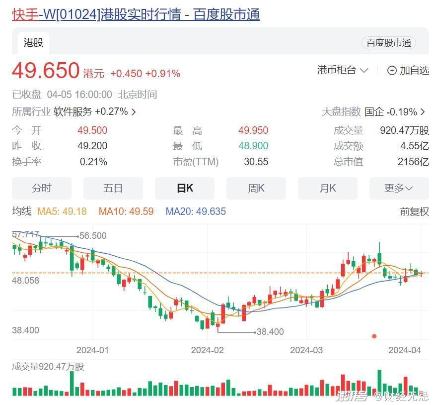 3月20日发布财报后,快手(1024.HK)的股价便开始了持续下跌,10个交易日内累计下跌了4.24%。截止4月5日收盘,为49.65港元/股。