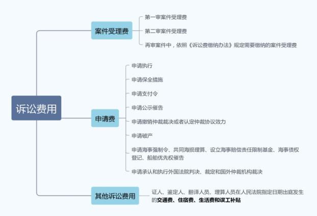 案件受理费:第一审案件受理费、第二审案件受理费、再审案件中,依照《诉讼费交纳办法》规定需要交纳的案件受理费。申请费:申请执行、申请保全措施、申请支付令等费用。