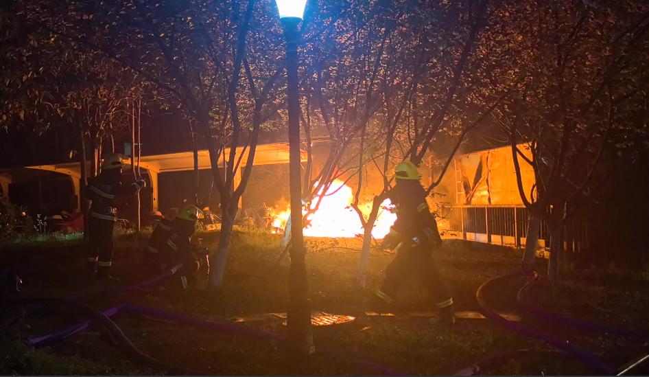 消防员赶赴现场将明火扑灭后但现场还存在车辆电池冒烟现象