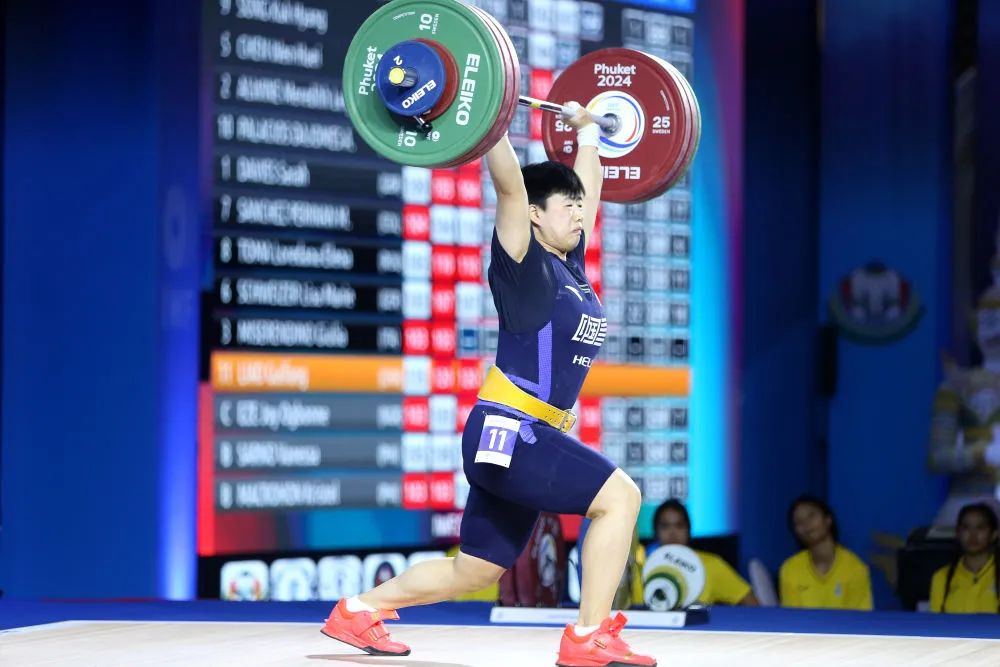 4月7日,廖桂芳在比赛中。新华社记者 王腾 摄7日在泰国普吉岛举行的2024年举重世界杯上,中国队选手廖桂芳收获女子71公斤级抓举铜牌以及挺举和总成绩银牌。美国选手里夫斯凭借稳定表现包揽3枚金牌。