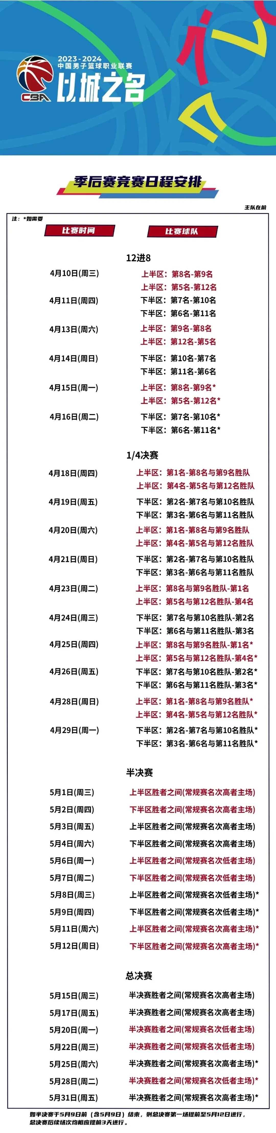 根据赛制,12进8将是三战两胜的赛制,八进四和半决赛都将采取五战三胜,总决赛则是七战四胜。季后赛首轮较量,将于4月10日开战,总决赛最晚于5月31日结束。
