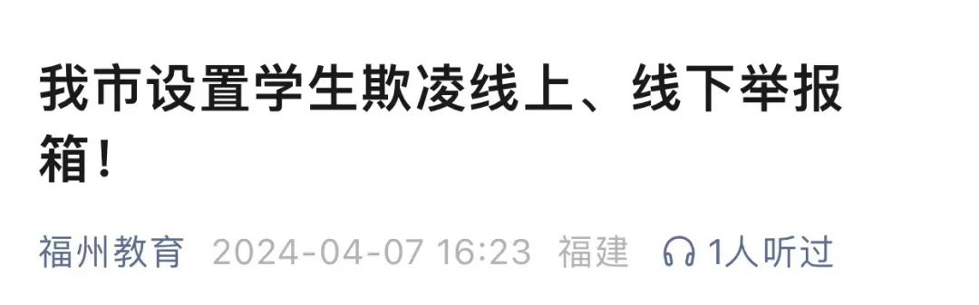 原标题:《整治校园欺凌,福州五部门联合放大招!全市中小学校(含中职)设置线上、线下举报箱》
