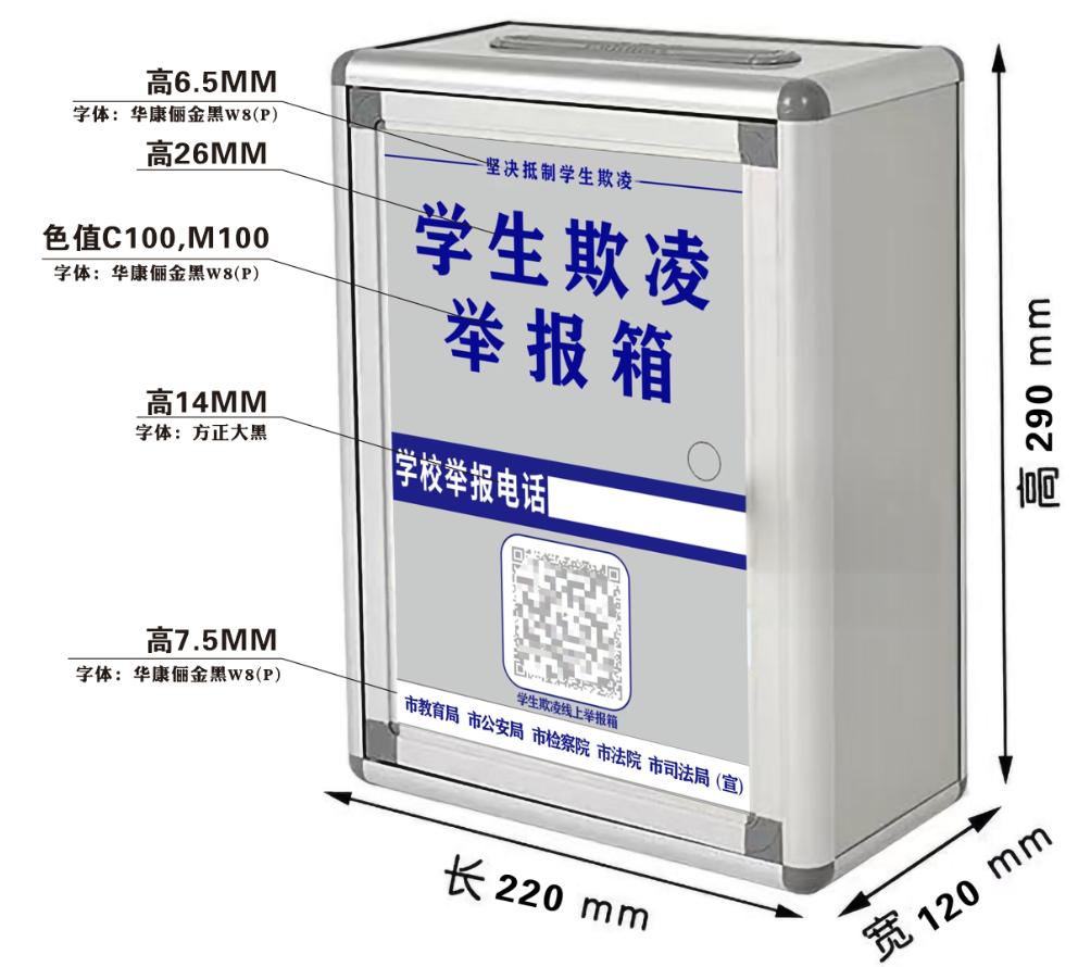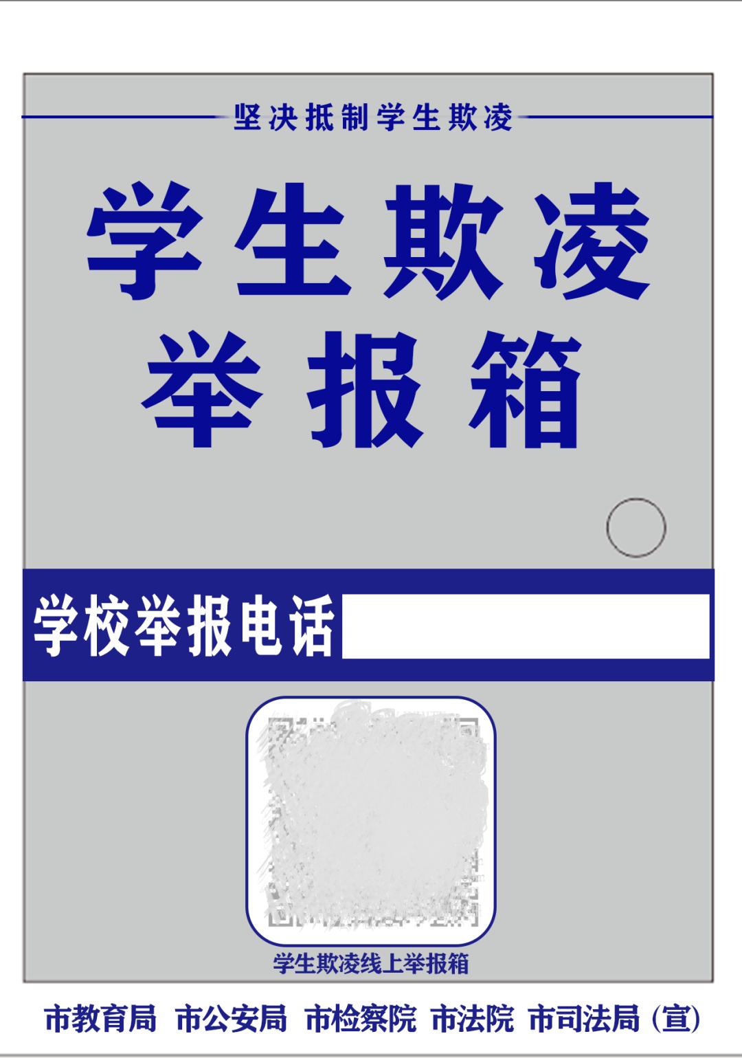 通知要求,各地各校要通过“线上+线下”双渠道收集学生欺凌线索并及时介入保护、调解和追究法律责任,保护全市中小学生安全。同步设置“线上+线下”举报信箱,线下举报信箱统一名为“学生欺凌举报箱”,并统一举报箱的标识、尺寸、规格、字体高度、字体大小和颜色等。线上“学生欺凌举报箱”由市教育局牵头搭建,并在线下举报箱明显处展示线上“学生欺凌举报箱”二维码链接入口,通过扫描二维码进入后填写相关信息即可完成举报。