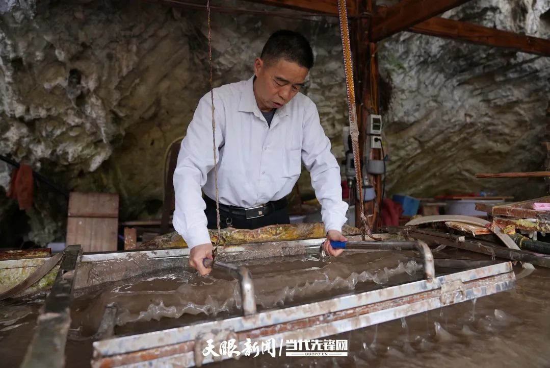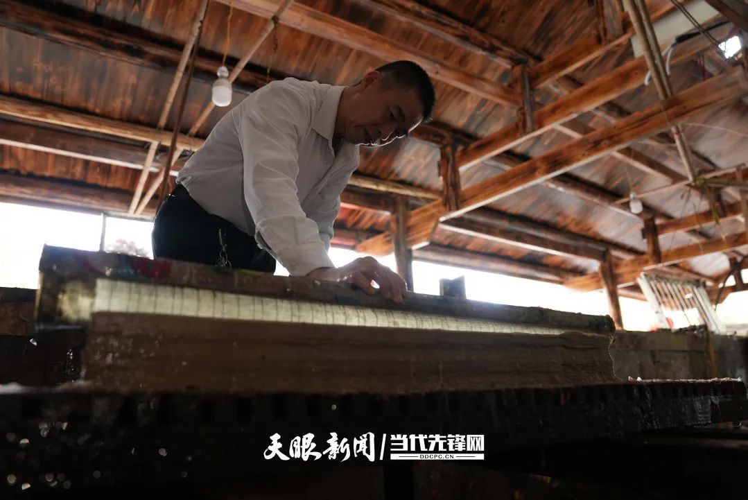 王兴武在揭纸“除了原材料,抄纸全凭经验,抄轻了纸薄,抄重了纸厚。”从15岁开始跟着父亲学习古法造纸的王兴武,已经在纸浆水里“泡”了43年,一张纸、一辈子。
