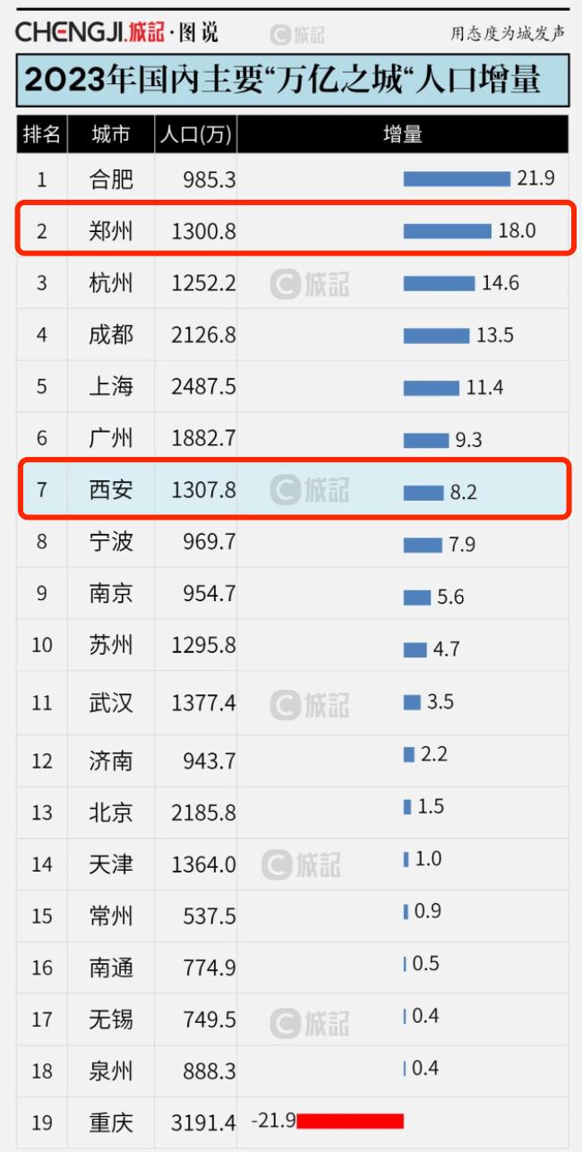但与之前的情况相比,情况确实发生了变化。因为这一增量目前在万亿城市中只能排到第七位。更重要的是,被郑州超过,时隔多年,首次失去了北方人口增量第一城之位。