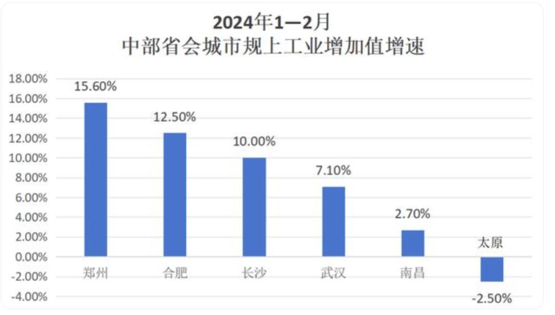 并且,从今年1-2月的情况看,郑州的表现依然亮眼。如规模以上工业增加值同比增长15.6%,增速在9大国家中心城市和中部省会城市中均稳居第一。