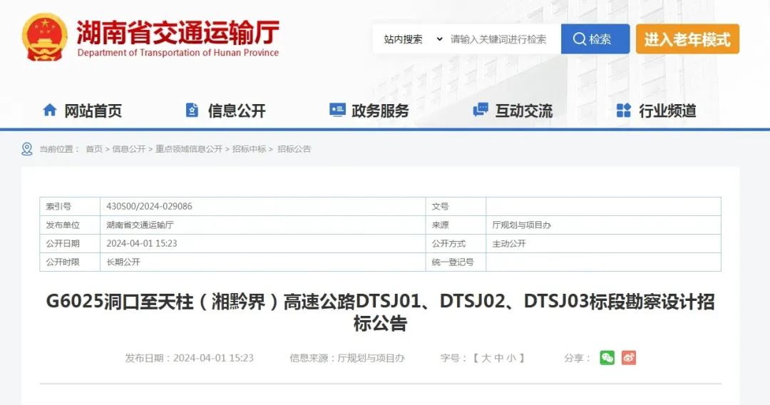 近日,湖南省交通运输厅发布公告,G6025洞口至天柱(湘黔界)高速公路(以下简称洞天高速)已列入湖南省高速公路网规划,项目已具备招标条件,现正对项目的初步勘察设计进行公开招标。G6025洞天高速设计路线起始于邵阳市洞口县石江镇,经高沙镇、花园镇、高椅乡、金竹镇、堡子镇、青朗乡,在蒲稳乡蒲稳村与洞天高速贵州段顺接。全长约131.8公里,按照双向六车道高速公路标准建设,设计速度采用120公里/时,路基宽度34米。全线桥梁58座28.9公里,其中特大桥6座共7.8公里,大桥46座2.07公里,中、小桥6座;隧道21座,约35.23公里,汽车荷载等级为公路-I级。估算投资296亿元。