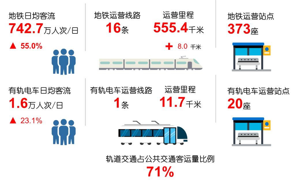 客流效益方面,全年地铁线网日均客运强度达1.35万人次/公里,高于北京、上海,略低于广州,位列内地城市第二。城市轨道交通客运量占全市公共交通客运量比例71%,城市轨道交通在城市公共交通体系中的主体作用更为突显。