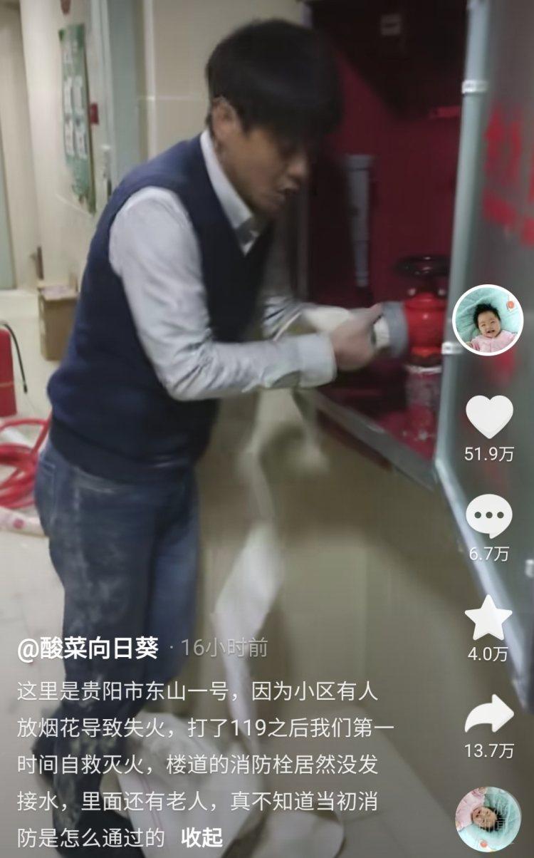 今年1月30日,贵阳市东山壹号小区发生一起烟花失火案,因消防栓无法接入水管致业主无法自救,引发网络关注。/受访者社交平台截图