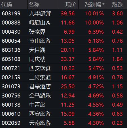 旅游板块异动拉升,峨眉山A、九华旅游直线涨停,天目湖、同庆楼、黄山旅游等跟涨。