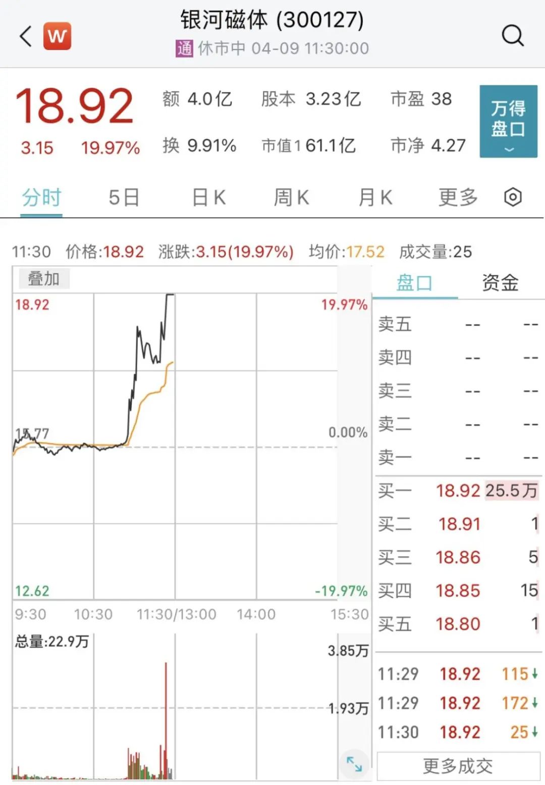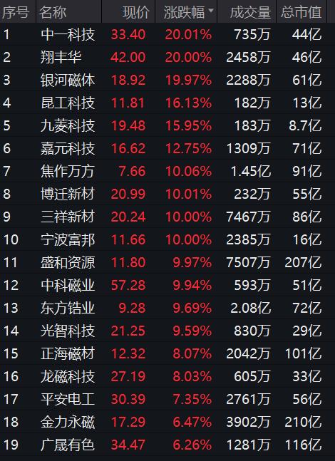 稀土永磁概念股快速拉升,银河磁体20CM涨停,盛和资源涨停,中科磁业、科恒股份、龙磁科技等涨幅超8%。