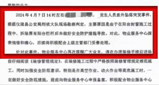 2024年4月7日14时左右,XX小区8栋发生人员意外坠落突发事件。根据仪陇县公安局刑侦大队现场勘察判定,主要原因是在阳台封窗施工过程中,拆除原有阳台栏杆后未做好安全防护措施,孩子不慎坠落。对此,物业服务中心深表惋惜和痛心,后续将积极配合上级主管部门妥善处理。