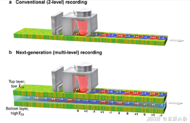 作者解释了传统的HAMR记录技术,分为单层与二级。其磁性北极或南极对于二进制中的1或0;而多级双层记录则在每层上有两个四二进制级:
