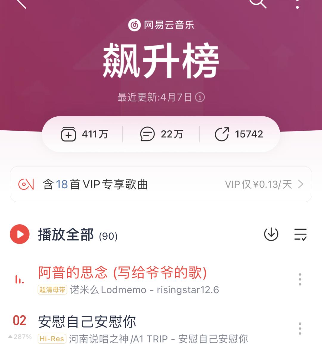 网易云音乐飙升榜 TOP1 也是他那首写给爷爷不是写给奶奶的歌,点赞数飙升到了 80 万。作为参考,谢帝那首人人都会哼两句的《 老子明天不上班 》点赞量为 1 万。