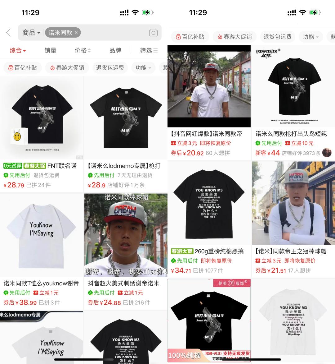 在拼多多,也有一堆商家早已上架了印着诺米金句的 T 桖。