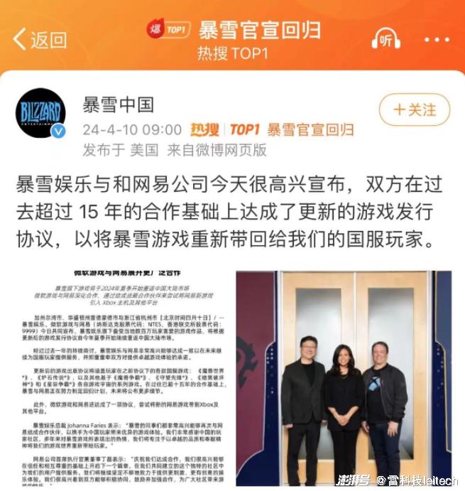 图片来源:微博这一消息也没有悬念地登上了热搜第一,不少玩家都表示期待暴雪和网易的进一步合作。此外新闻稿还提到「微软游戏和网易达成一项协议,尝试将新的网易游戏带到 Xbox 及更多平台」,就连微软游戏 CEO 菲儿·斯宾塞(Phil Spencer)也为此次合作站台,由此可见暴雪和微软有多重视此次合作。