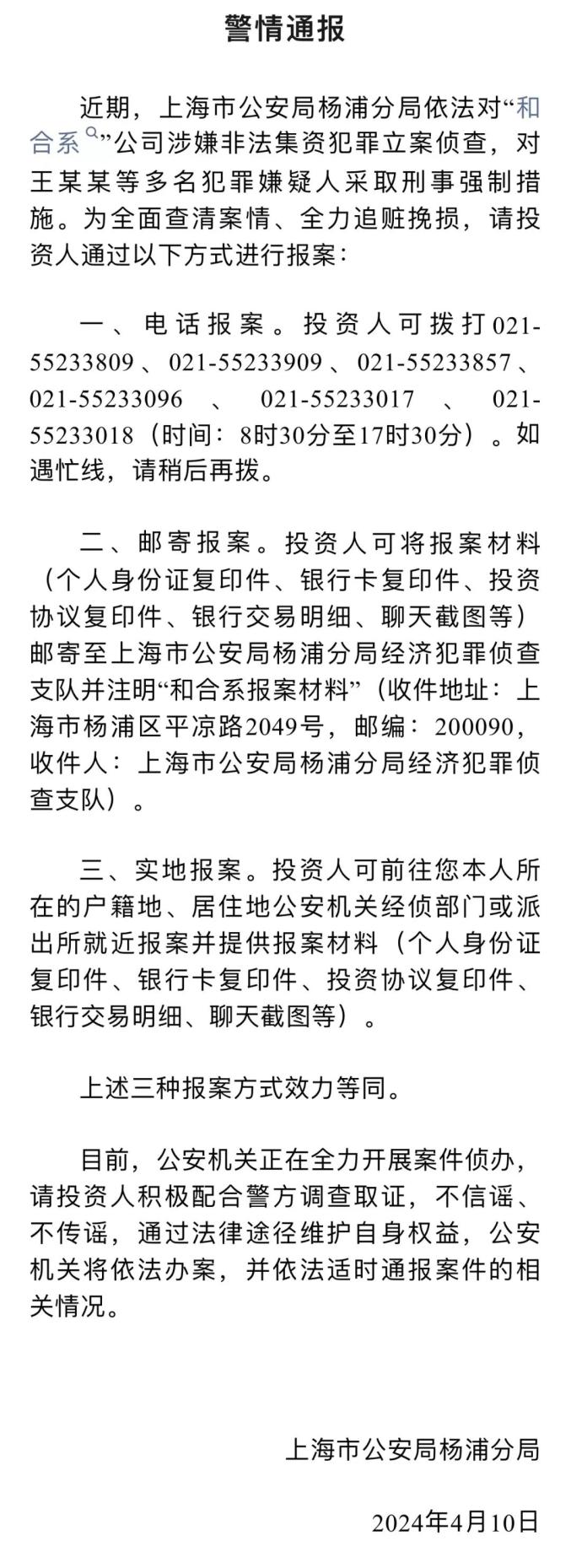 来源:上海市公安局4月10日,上海市公安局杨浦分局发布警情通报称,近期,上海市公安局杨浦分局依法对和合资产管理(上海)有限公司、上海和合首创投资管理有限公司(以下简称和合首创)等“和合系”公司涉嫌非法集资犯罪立案侦查,对王某某、梁某某等多名犯罪嫌疑人依法采取刑事强制措施。