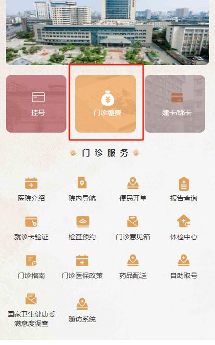 医生开单完成后,进入公众号,点击主页“门诊待缴费提醒”或点击“就医服务”→“门诊缴费”。
