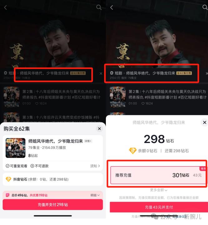 ▲ 短剧《师姐风华绝代少爷隐龙归来》付费页面