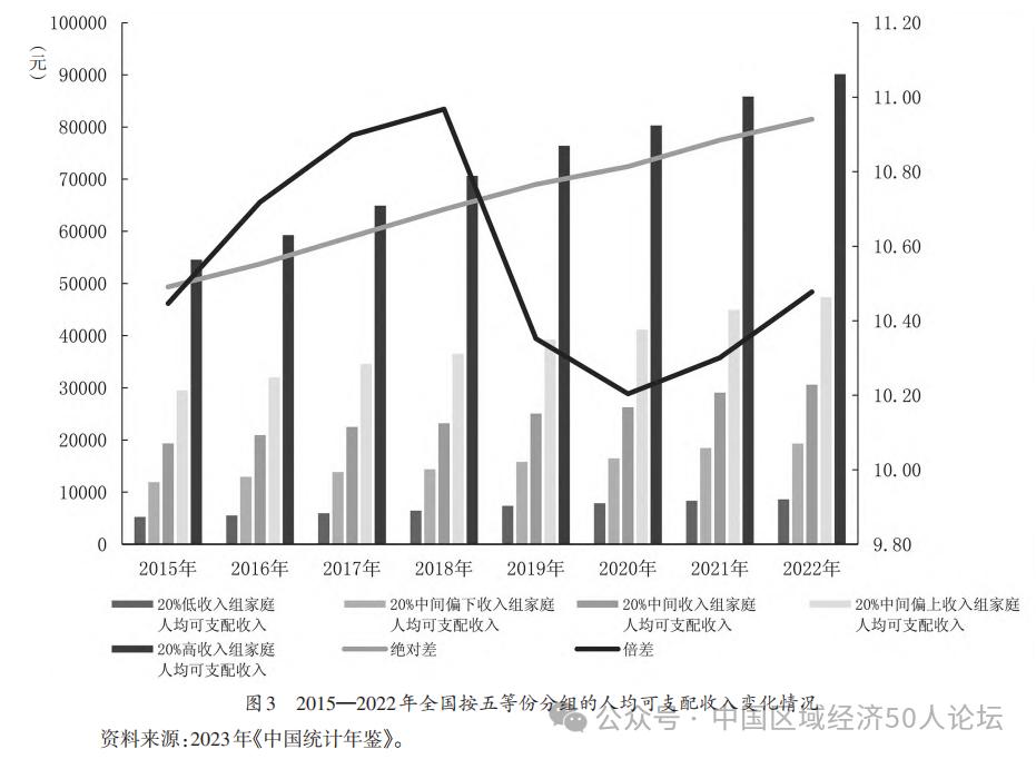 国家统计局数据显示,1978年,中国收入基尼系数为0.317,2008年达到峰值0.491,此后见顶回落,维持在0.46—0.47,2022年为0.47,中国收入差距在世界处于中等偏高水平,基尼系数高于0.4这一警戒线。缩小收入差距,促进财富的公平分配,依然是急需解决的问题。根据2023年《中国统计年鉴》,将全国家庭人均收入水平按照五等份进行统计,2022年包含20%低收入家庭人均可支配收入为8601元;中间偏下收入组人均可支配收入为19303元;高收入户人均可支配收入为90116元,高收入组的人均可支配收入较低收入组高出81515元,是低收入组的10.48倍(见图3)。从2015年以来,高低收入组人均可支配收入的倍差有所缩小,但绝对差值一直呈上升趋势(肖金成等,2022)。