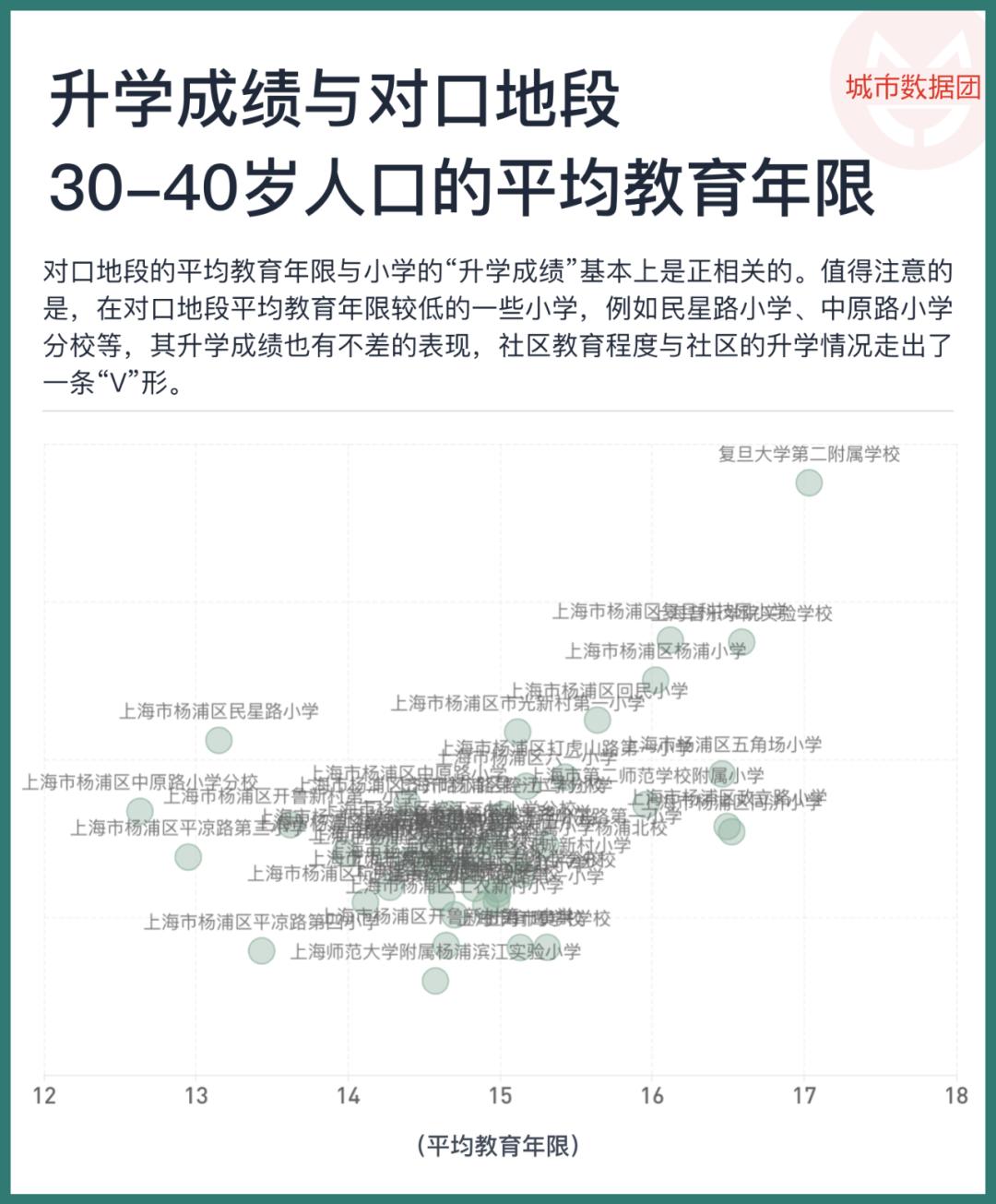 可以看到,对口地段的平均教育年限与小学的“升学成绩”基本上是正相关的,升学成绩最好的复旦大学第二附属学校、复旦科技园小学、上海音乐学院实验学校、杨浦小学等,其对口地段的平均教育年限也是所有社区中最高的。值得注意的是,在对口地段平均教育年限较低的一些小学,例如民星路小学、中原路小学分校等,其升学成绩也有不差的表现,社区教育程度与社区的升学情况走出了一条“V”形。