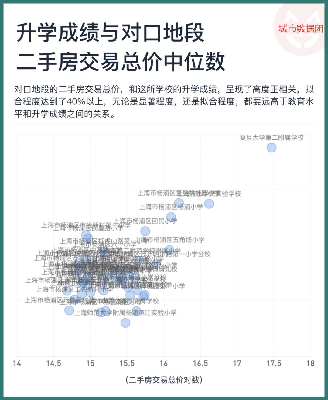 上图中可以看到,对口地段的二手房交易总价,和这所学校的升学成绩,呈现了高度正相关,拟合程度达到了40%以上,无论是显著程度,还是拟合程度,都要远高于教育水平和升学成绩之间的关系。