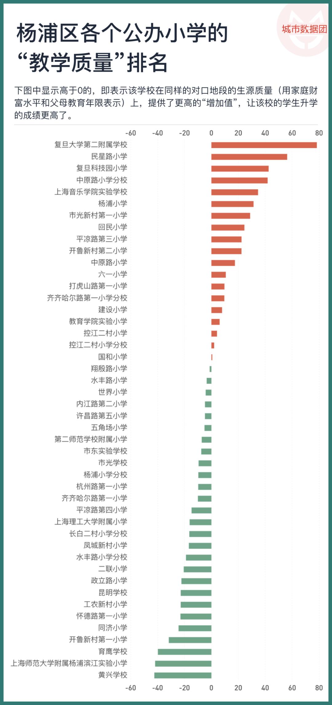 上图中显示高于0的,即表示该学校在同样的对口地段的生源质量(用家庭财富水平和父母教育年限表示)基础上,提供了更高的“增加值”,让该校的学生升学成绩在同等生源质量的水平上更高了。可以看到,之前几所对口地段教育水平不高,但升学成绩较好的民星路小学和中原路小学分校在该图中也位于前列。