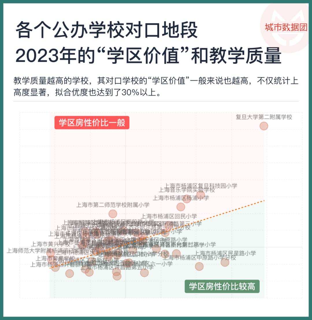 下图列出了2023年时各个公办学校对口地段的“学区价值”和该校的“教学质量”之间的关系。