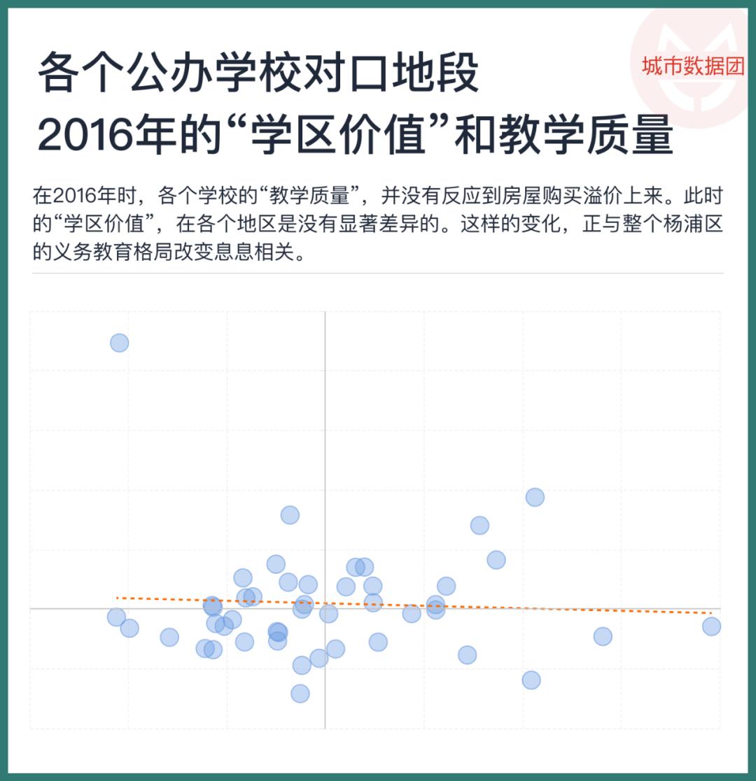 前文提到的公办学校的教学质量在学区上的“折现”,在不同年份也并不相同,下图我们用同样的方式算出了2016年的购买溢价和教学质量的关系。
