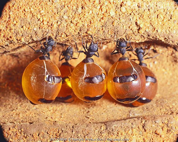 这些蚂蚁在吃掉食物后,会将其转化为糖浆,这些糖浆保存在腹部,并导致腹部严重肿胀,就像一个蜜罐一样。