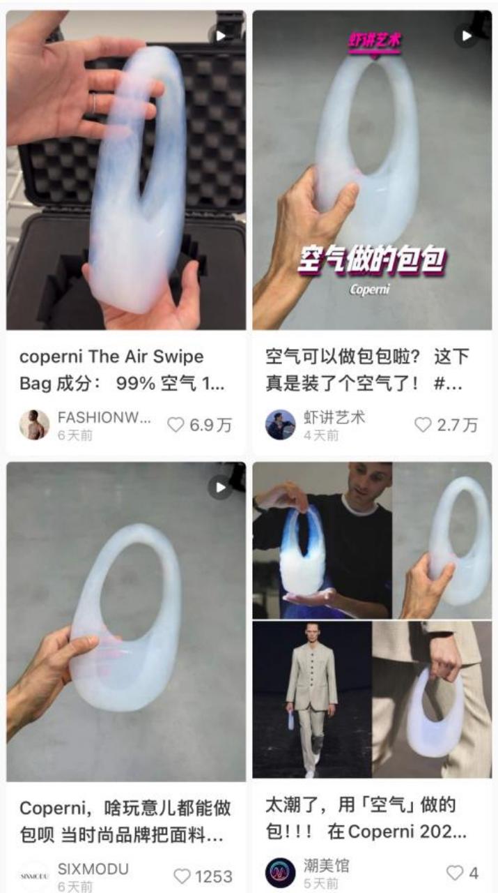 秀场上“大受震撼的单品”在国内社媒也在同步发酵。巴黎前卫品牌Coperni跟NASA合作出的“99%的空气+1%玻璃”手袋刚在秀场亮相,转头就在小红书收获点赞几万,尽显平台带货属性。有人调侃迷惑设计“融不进去的圈子不要融,致我的手机”,有人真的挺好奇:这玩意手感摸起来咋样啊?顺便喊话义乌:看你的了。