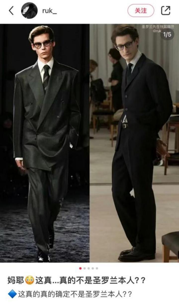 不得不佩服,线上看秀的网友一个比一个专业,对品牌创始人如数家珍。看到时装周上YSL秀场开场模特的一瞬间国内网友就不淡定了,一袭西装眼镜黑框的男模上让小红书女孩陷入沉思:“这人看起来咋这么眼熟”?恍惚着感叹:这是上哪儿搜罗到这么像圣罗兰老爷子本尊的男生?并称其为“三八妇女节最好的礼物”。