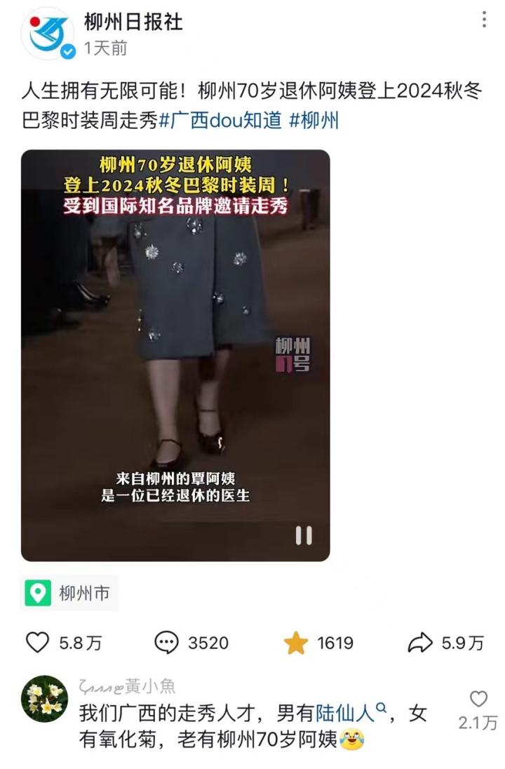 而另一位在奢牌MiuMiu秀场大放光彩的是一个广西70岁退休阿姨。这位奶奶辈迈着铿锵有力踩点步伐的短视频在抖音发酵,抖人看了陷入沉思:她71在巴黎风华正茂,我30起个床都容易两眼一黑又睡过去。仍然有网友纳闷:凭啥这位素人老太太能被MiuMiu邀请?