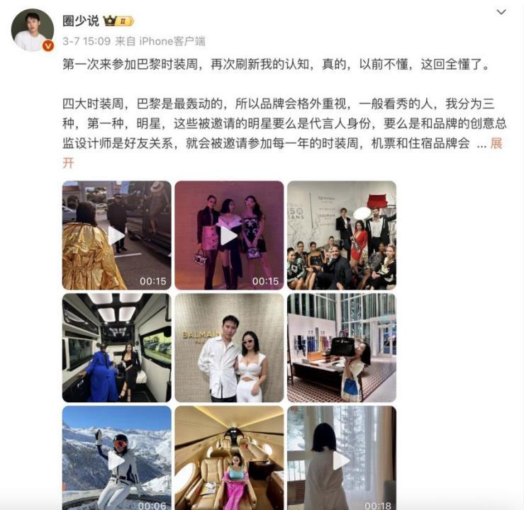 时尚博主@圈少说 表示自己也是第一次参加巴黎时装周,被刷新认知的同时顺便回答网友们最关心的问题:到底谁能来参加时装周?除了可以花钱买票进的类型,总结下来可以受邀参加的分三种类型:明星、媒体KOL以及VIC客户。