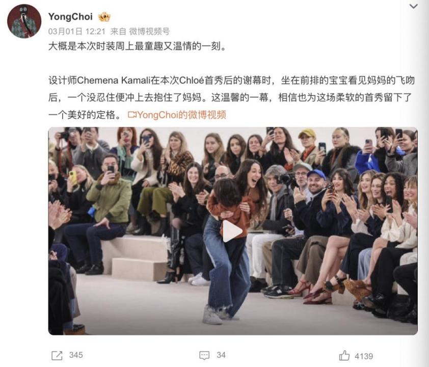 比如奢侈品设计师在微博的全民讨论中变成“亲切的邻家大姐”。时尚博主@YongChoi 放出一段Chloé新任设计总监Chemena Kamali在首秀谢幕为观众送飞吻的视频。