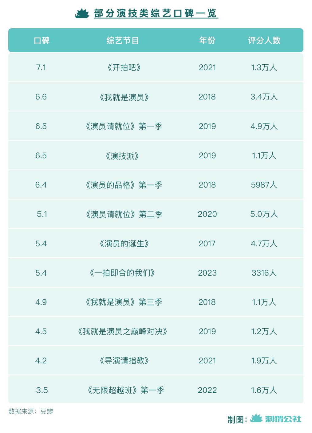 刺猬公社总结了较为出圈的演技类综艺的口碑发现,7.1分已经是这个赛道的高分存在,但1.3万的评分人数并不算多。