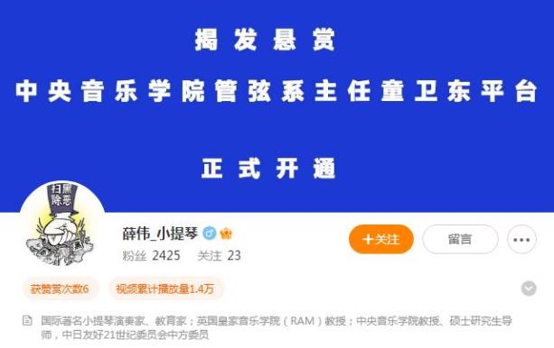 近日,一位账号简介为“中央音乐学院教授薛伟”的微博账号发帖称,公开悬赏征集同校管弦系主任童某某违法线索。