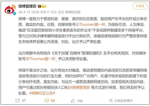 微博社区13日发布公告:微博一直致力于营造和谐、健康、美好的社区氛围,鼓励用户在平台创作或分享优质、真实的内容。近期,自媒体账号@Thurman猫一杯_ 为吸粉引流,人为策划、编造“在法国巴黎拾到小学生秦朗丢失的作业本”不实视频并散播至多个网络平台,警方已对其涉嫌传播网络谣言行作出行政处罚。该编造虚假视频行为严重损害网络生态秩序并浪费公共资源,对此,站方予以严肃处置:
