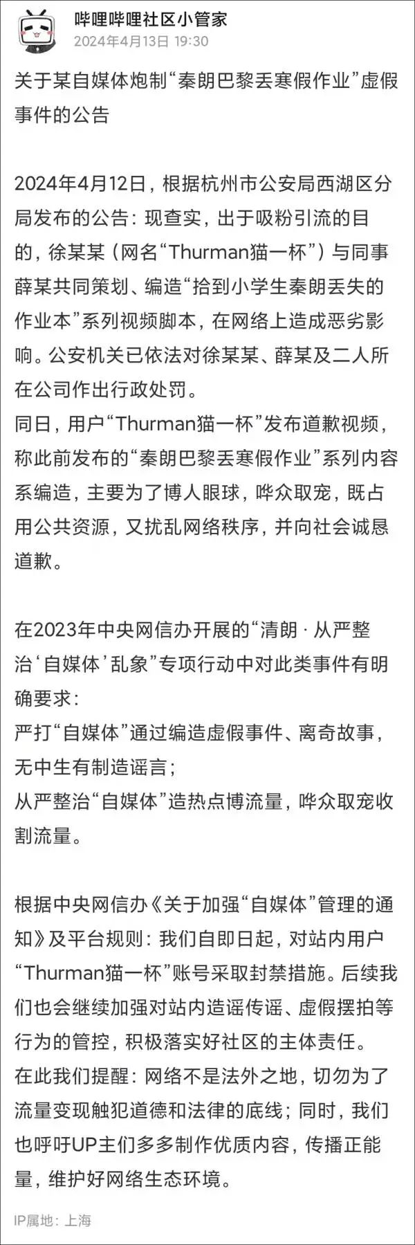哔哩哔哩社区小管家发布公告:2024年4月12日,根据杭州市公安局西湖区分局发布的公告:现查实,出于吸粉引流的目的,徐某某(网名“Thurman猫一杯”)与同事薛某共同策划、编造“拾到小学生秦朗丢失的作业本”系列视频脚本,在网络上造成恶劣影响。公安机关已依法对徐某某、薛某及二人所在公司作出行政处罚。