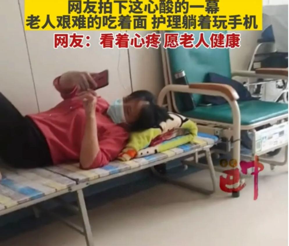 而在一旁的陪护床上,花高价请来的护工正在躺着玩手机。