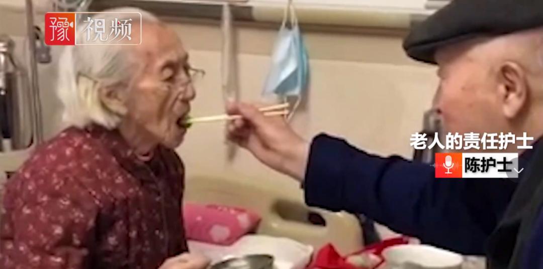 老奶奶生病入院,身子骨还很硬朗的老爷爷,每天带着可口的饭菜去看望老伴,亲自将饭菜喂到老伴嘴里。
